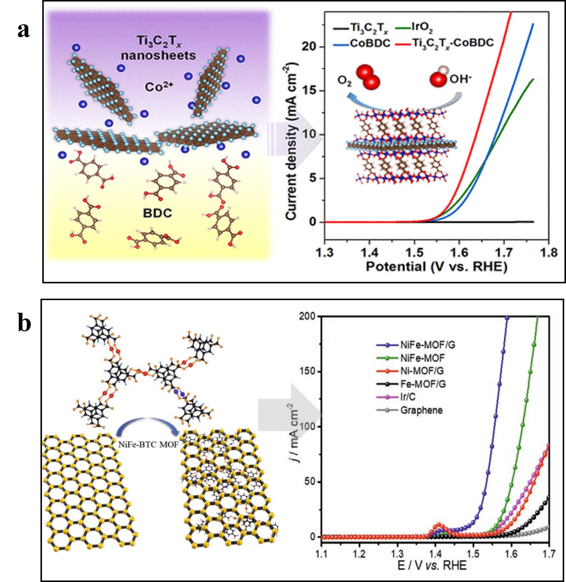 Figure 6. (a) Schematic illustration of Ti3C2TX nanosheets and LSV curves [29]; (b) Schematic illustration of NiFe-BTC MOF and LSV curves [30]