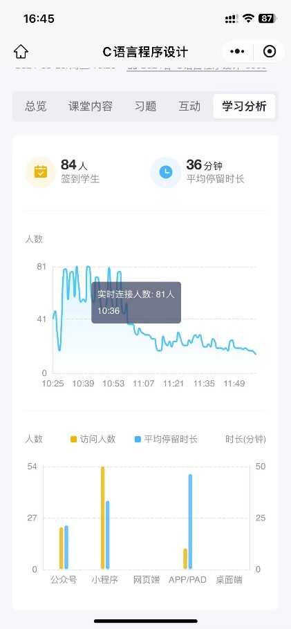 图4主要展示了参与互动的学生人数与时间点,图5统计了签到人数、停留时长及各种客户端连接统计。