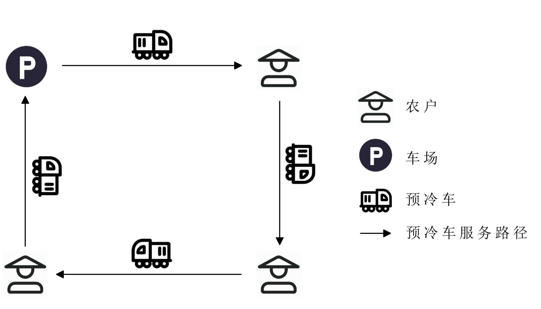 移动设施预冷模式由配备移动预冷装置的预冷车从车场出发,到农户所在地进行农产品预冷服务,完成服务预冷车再回到车场(见图2)。该模式极大地提升了预冷服务的灵活性与便捷性,特别适合农户分散、地形复杂或交通不便的地区。相比固定设施预冷模式,移动预冷模式显著缩短了农产品运输距离与时间,降低了损耗,提升了鲜度保障。然而,移动设施预冷模式主要限制在于较高的设备购置和维护成本。此外,道路条件会直接影响预冷车的服务范围和效率。在交通不佳的地区,恶劣的道路状况可能限制预冷车的通行,甚至影响预冷服务的质量。例如,在四川和云南的一些山区农场,农户分布较为分散,固定设施难以覆盖,移动设施预冷模式成为理想选择。这种模式使农户能够在本地完成预冷处理,减少长途运输对农产品新鲜度的影响。尽管移动设施预冷模式在偏远地区展现了显著优势,但其高昂的成本对部分小规模农户而言可能难以负担。因此,在实际应用中,需要综合评估区域特点、经济可行性及技术支持水平,以确保选择的预冷模式能在效率与成本之间取得最佳平衡。