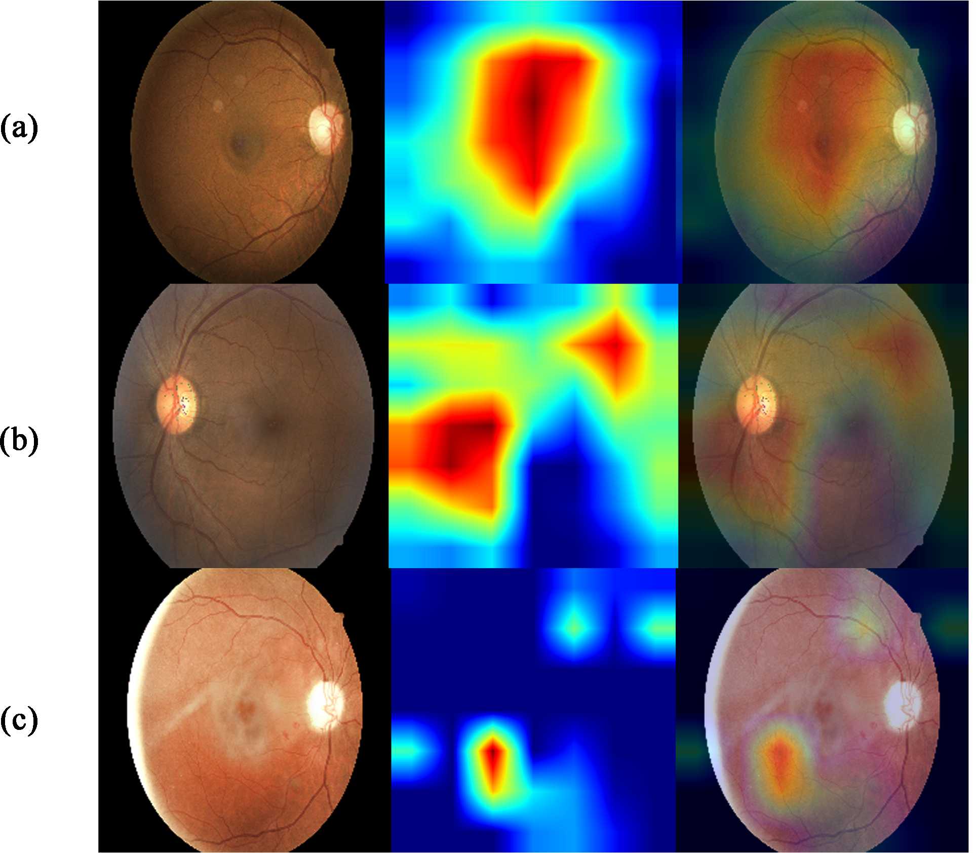如图4所示,图4(a)为DR眼底图片,图4(b)为对应热图,图4(c)为前两者叠加后的效果图。