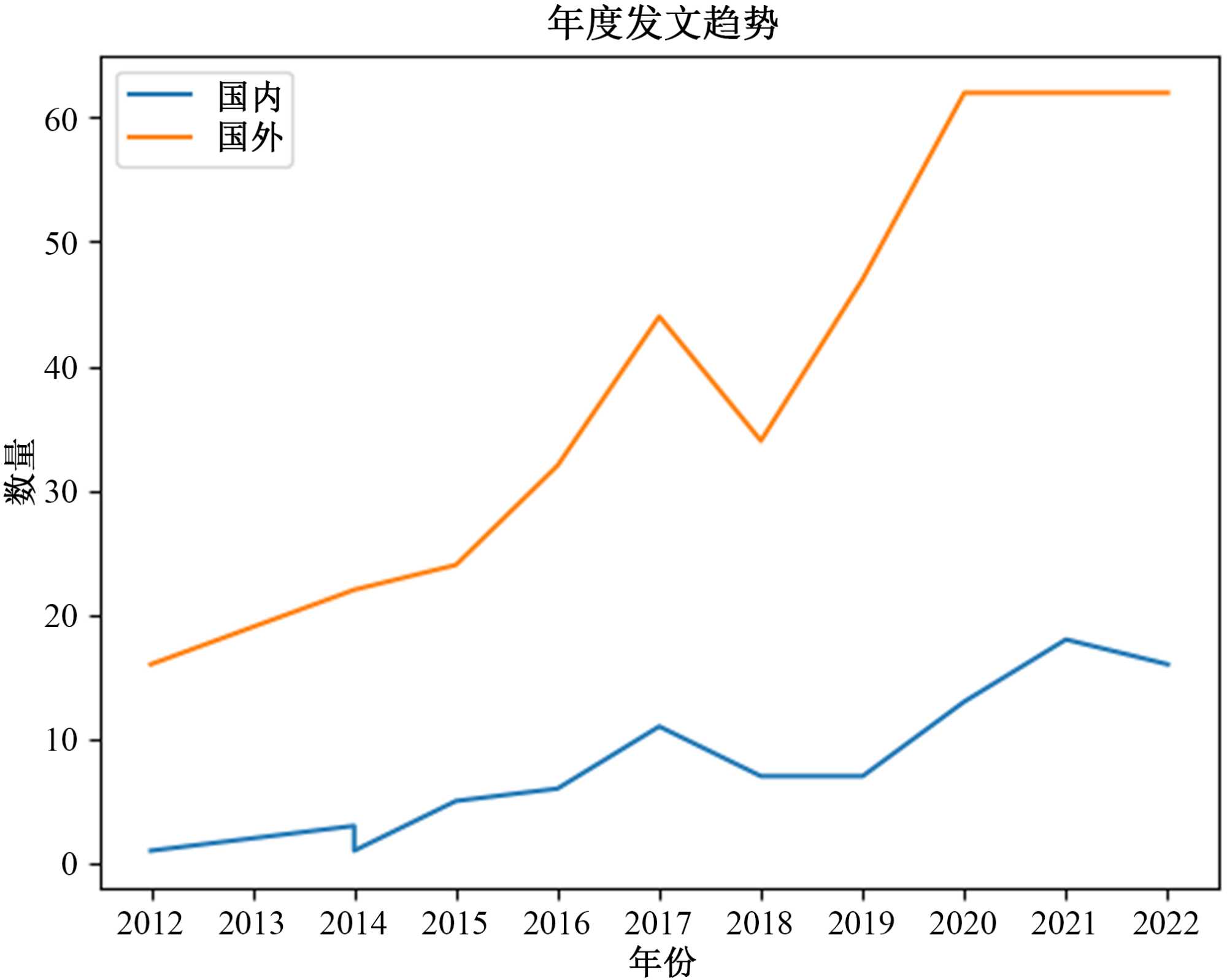 通过分析年度文献发表数量可以总结出相应的研究发展趋势(李贺等,2014)。本次主要是对国内外期刊发表数量进行对比。由于检索时间为2023年,无法确定2023年完整年度发文数量,故此处仅对2012年~2022年的年度发文量进行分析。在经过分析后,年度分布统计分析后如图1所示,可发现该领域的发表数量大体呈现上升趋势,但国外发表数量显著高于国内。