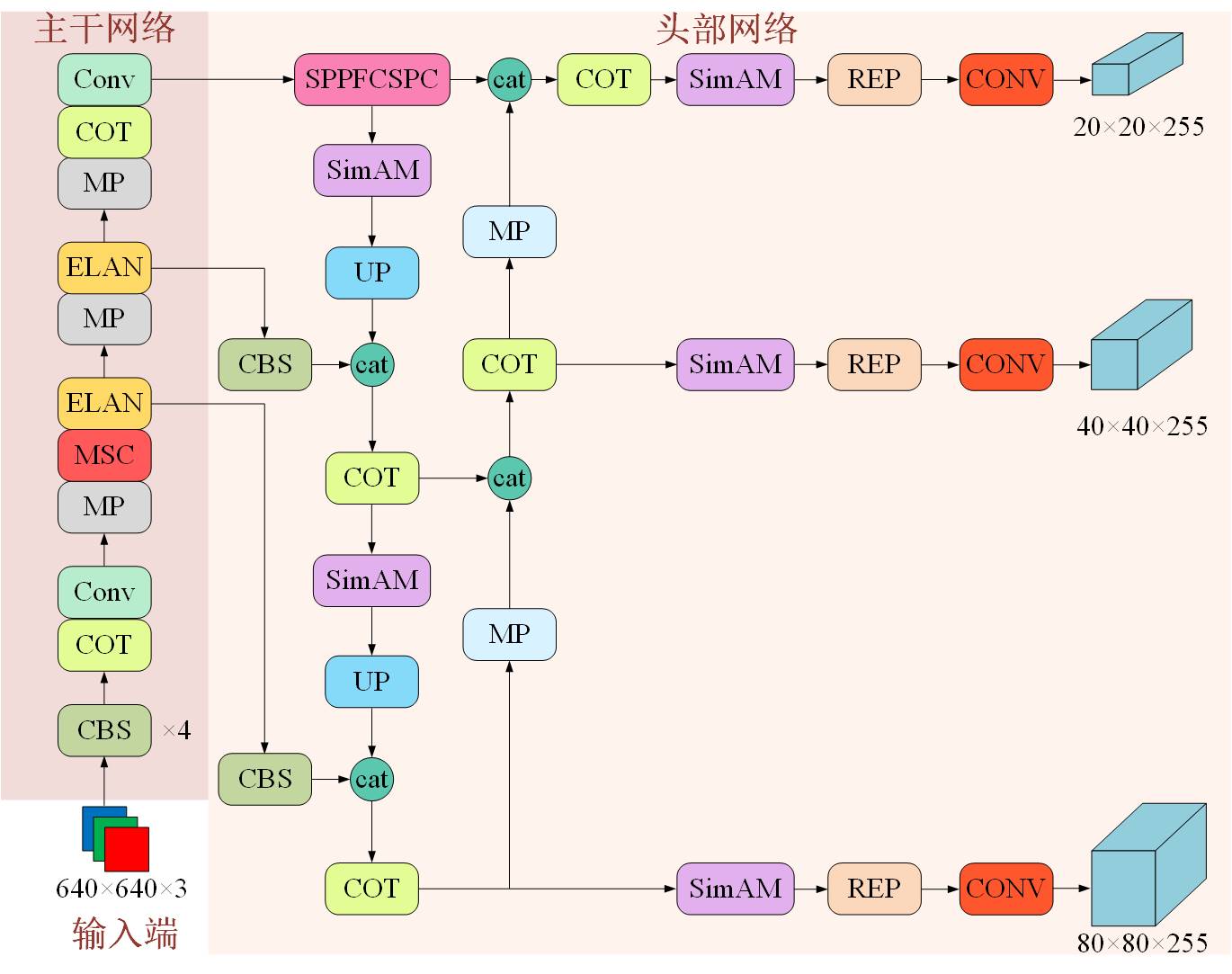 视觉检测模块使用改进的YOLOv7的RGB图像目标检测方法,其主要结构如图5所示。它的主要改进原理是结和COT (Contextual Transformer)结构,改进YOLOv7主干,指导动态注意力矩阵的学习,增强视觉表征能力[8]。其次,在主干网络的第一个池化层后面添加了MSC模块,扩大感受野,更好地理解全局特征信息,提高检测精度;最后在头部网络的特征融合部分添加了三维SimAM注意力机制,能够对不同通道和空间位置的神经元分配不同的注意权重。在不增加参数的情况下,避免结构复杂化,利用该注意力机制加强目标在提取特征中的权重并抑制背景干扰权重,从而提升模型检测性能。