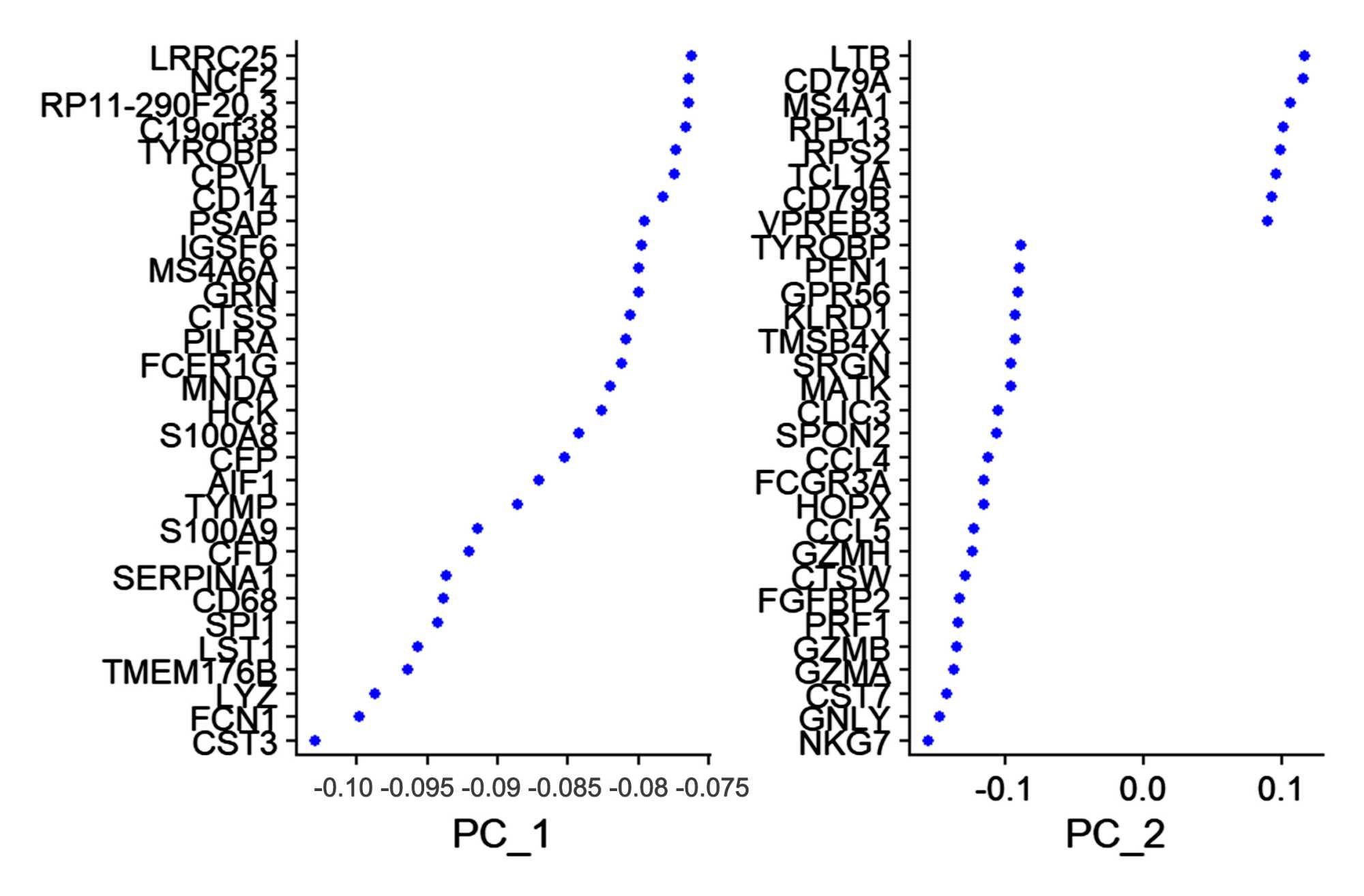 可视化细胞与特征间的PCA有三种方式:(1) 使用VizDimLoadings函数,用于可视化与降维结果相关的基因,了解各个基因对主成分的贡献程度(如图5所示)。(2) 使用DimPlot函数,将降维技术的输出绘制在二维散点图上。每个点代表一个细胞,并且根据降维技术确定的单元嵌入进行定位(如图6所示)。(3) 使用DimHeatmap函数,绘制某个主成分的热图,这个热图会根据主成分得分对细胞和基因进行排序,从而允许用户直观地观察数据集中异质性的主要来源(如图7所示)。本文选取前五个主成分,打印每个主成分前5个贡献最大的基因,即最重要的特征基因。
