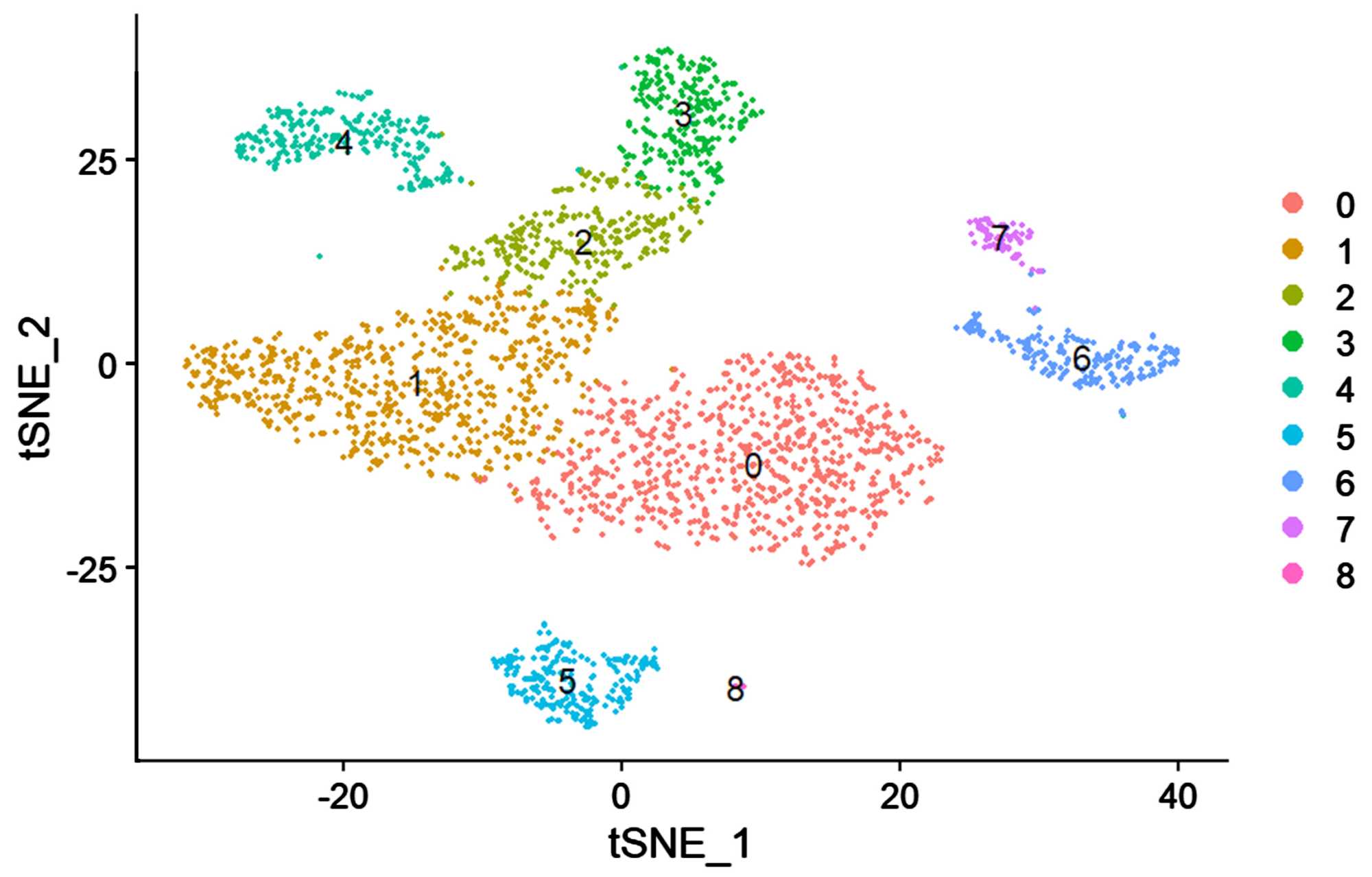 使用UMAP和t-SNE算法对上述处理的细胞进行聚类。perplexity参数的选择对于聚类效果至关重要,perplexity参数影响局部和全局结构的平衡,较小的perplexity,更关注局部结构,容易导致小群体紧密聚集,较大的perplexity更关注全局结构,使不同类群更加分散。通常细胞数小于1000个perplexity参数选择5至20,1000个到5000个细胞perplexity参数选择20至50,大于5000个细胞perplexity参数选择30至100。由于本文数据超过了5000个,选择perplexity参数为30 (见图9,图10)。