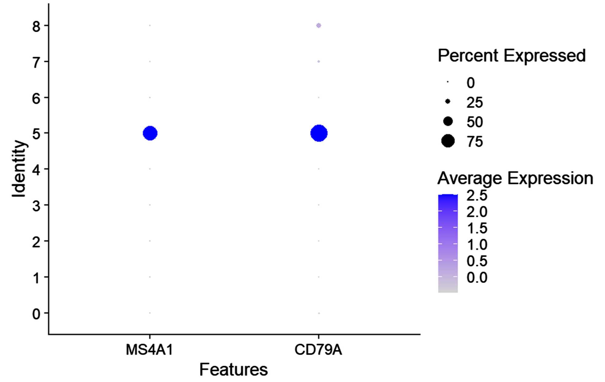 图14. MS4A1与CD79A在不同细胞群体中的DotPlot表达图