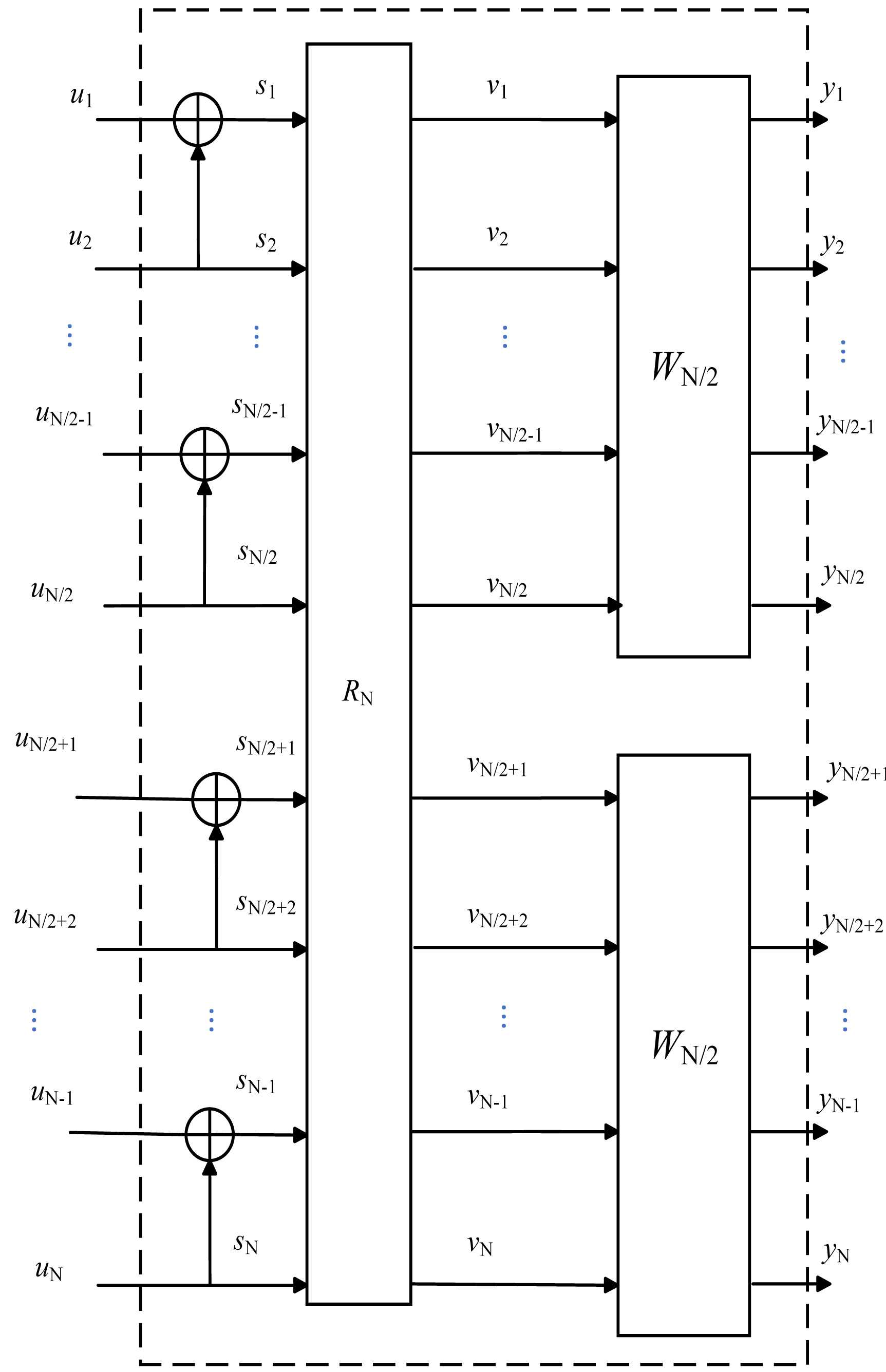 WN的信道联合图如图2所示,其中RN是一种比特置换结构,用于把奇数索引的元素重新打乱排列成偶数索引元素。